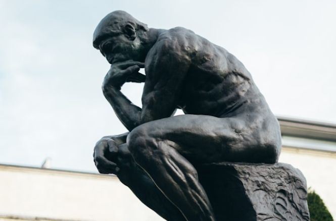 Mijn blik ging naar de ansichtkaart en langzaam draaide ik deze een kwartslag om. De mij vertrouwde afbeelding van een bronzen figuur die zijn middelvinger, wijsvinger en duim tegen zijn wang laat rusten werd zichtbaar. Een symbool van reflectie.